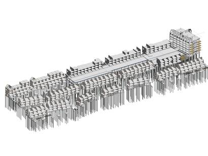 Het plan bestaat uit meerdere blokken grondgebonden woningen en een 7-laags appartementengebouw. Tussen verschillende woningen in een daktuin gecreëerd met daaronder een parkeergarage. T